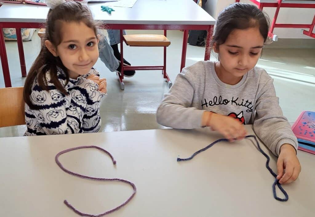 Die Kinder der 1. Klassen experimentieren mit einem Wollfaden.