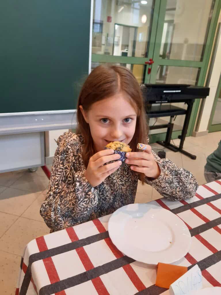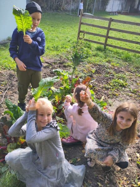Im Rahmen der Sternstunde für die 3. Klassen wurde in der „Küchenwerkstatt“ Mangold vom Schulacker geerntet und anschließend in der Schulküche zu köstlichen Mangoldmuffins verarbeitet